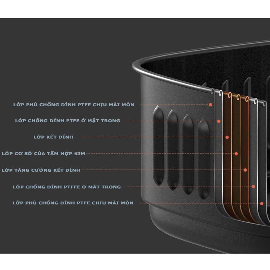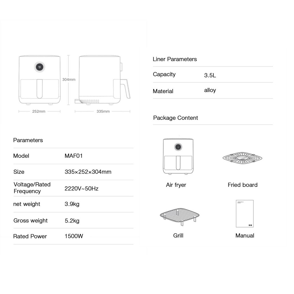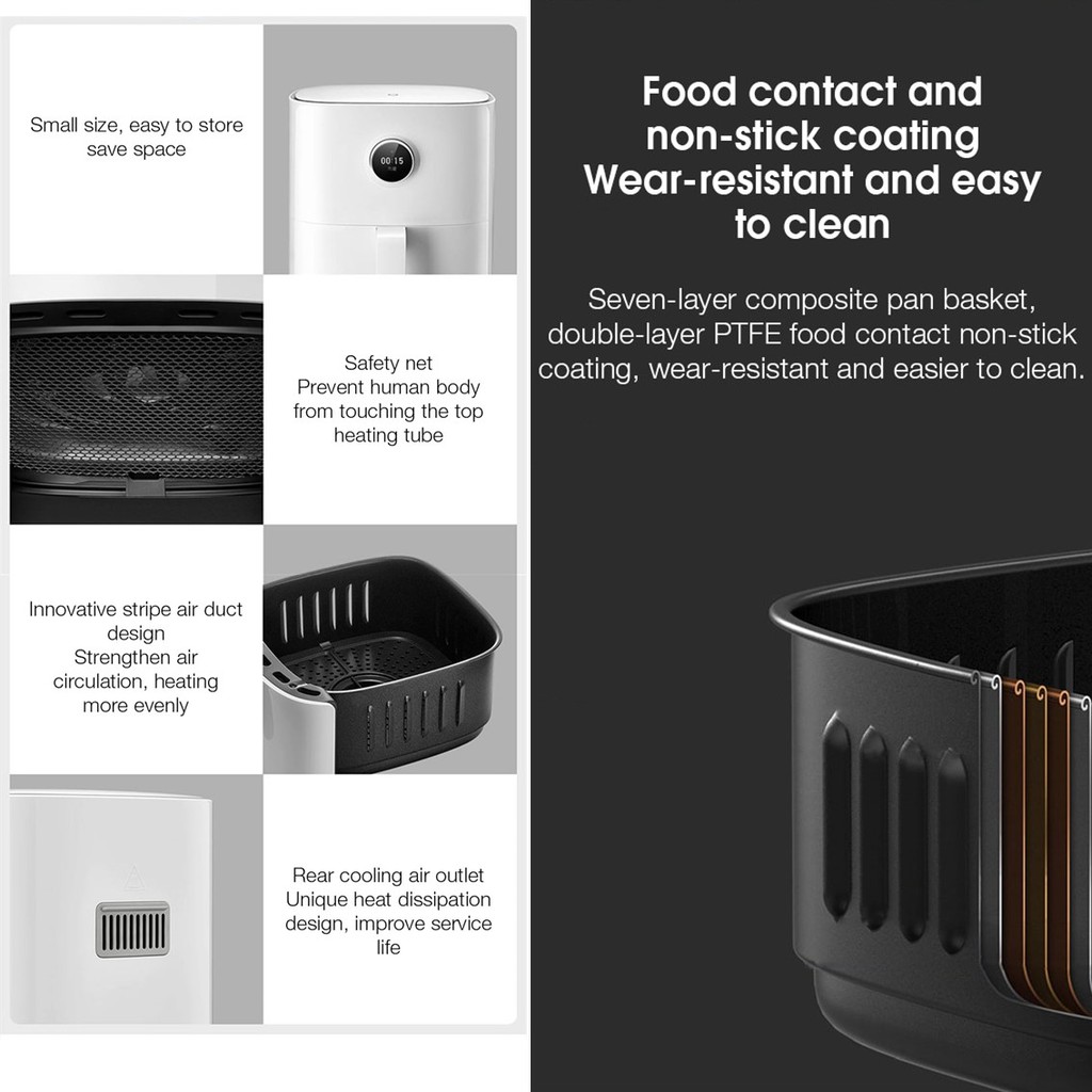 Về kích thước, nồi chiên không dầu Mijia có kích thước nhỏ gọn 335 x 252 x 304mm, được gia công từ vật liệu hợp kim. Phần nồi chiên được cấu tạo từ 7 lớp, trong đó bao gồm 2 lớp chống dính PTFE đảm bảo an toàn thực phẩm. Nồi có dung tích 3.5L có thể đáp ứng nhu cầu sử dụng của 1 đến 5 người.