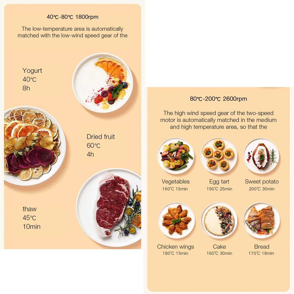 Nồi chiên không dầu Mijia MAF01 3.5L được nhà sản xuất giới thiệu là có thể tích hợp các tính năng khác như làm sữa chua, sấy khô hoa quả, lò vi sóng, lò nướng điện... Để làm được điều này, nồi chiên không khí Mijia có phạm vi điều chỉnh nhiệt khá rộng từ 40 đến 200°C, không chỉ chiên mà còn có thể rã đông và lên men.