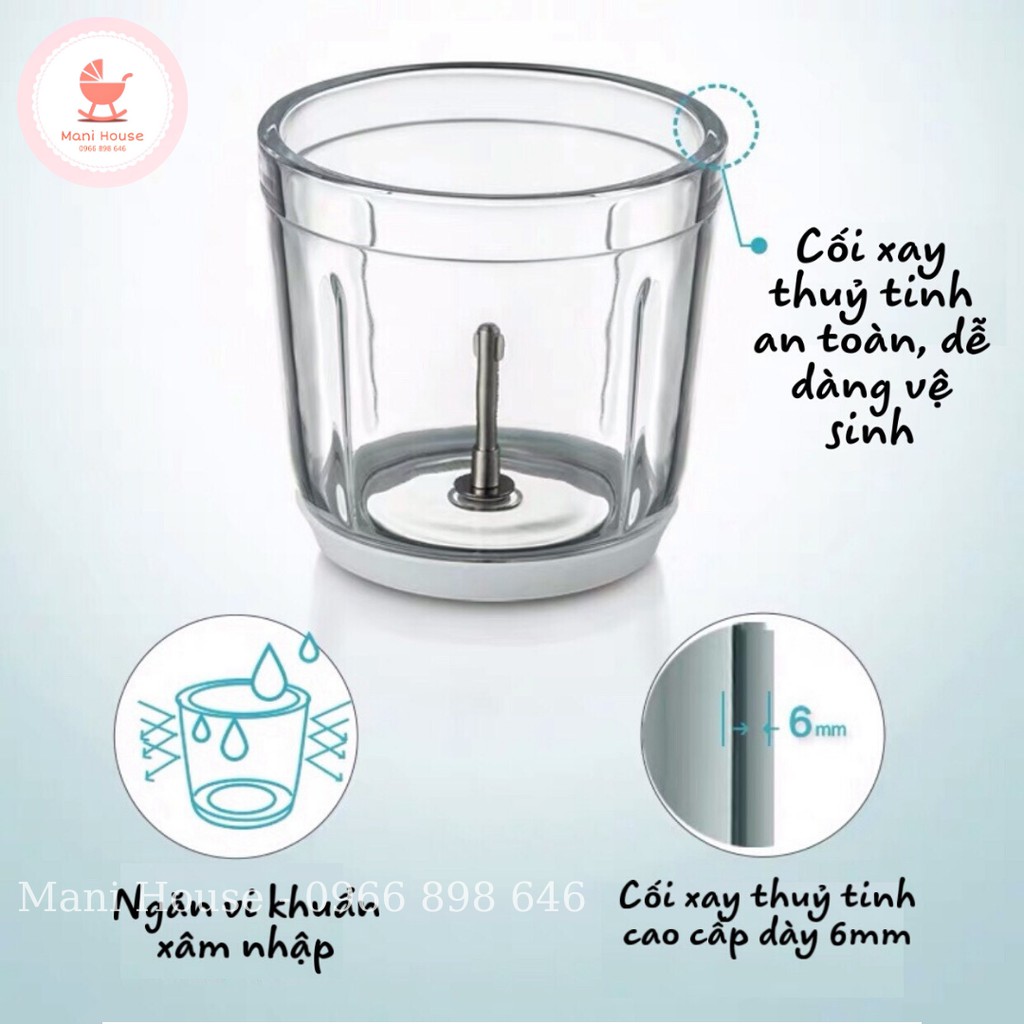 Cối xay được làm bằng thuỷ tinh dễ dàng vệ sinh, tiệt trùng, không bị vi khuẩn bám bẩn như các loại cối bằng nhựa khác trên thị trường. Dung tích 0,6L đủ xay đồ cho bé ăn cả ngày