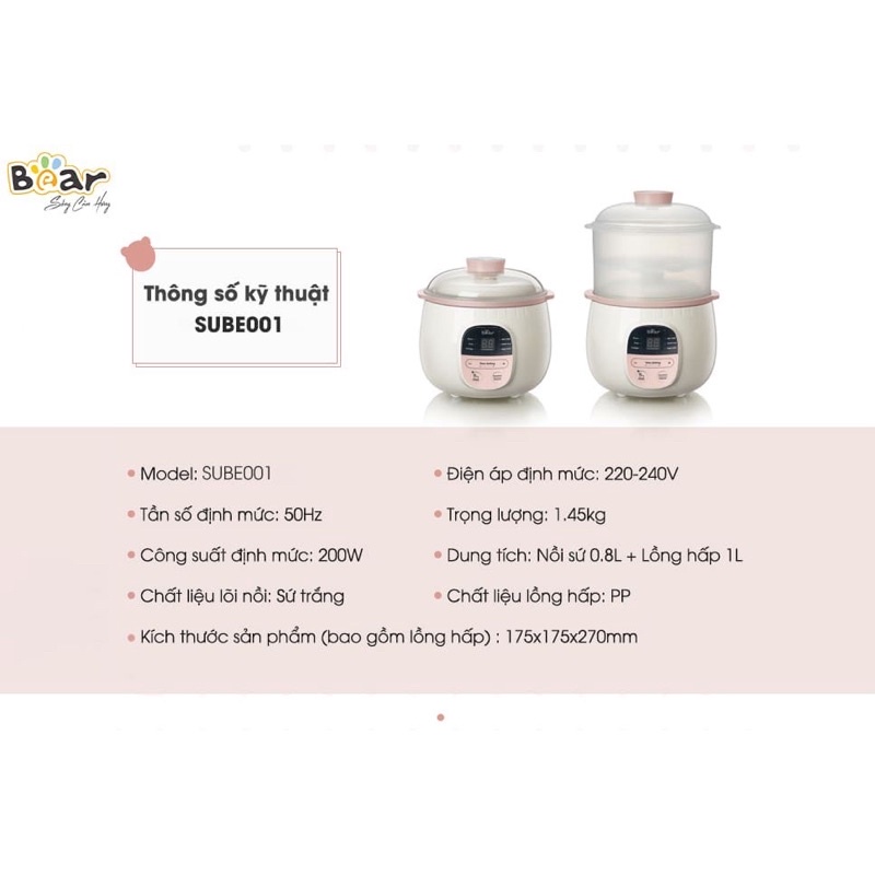 Nồi nấu chậm BEAR, nồi nấu cháo cho bé, ninh, hầm, cách thủy dung tích 0.8L chính hãng Bear bảo hành 18 tháng SUBE-001 - 4 In 1 đa năng✔️Dễ sử dụng:bản Quốc tế kèm HDSD tiếng Anh và Việt