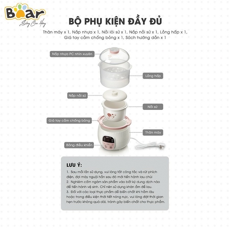 Nồi nấu cháo chậm Bear 1,6L và 0.8L phiên bản quốc tế nha cm ơi- 6 chức năng: hấp, hầm canh, nấu cháo, chưng yến, nấu chè, giữ ấm