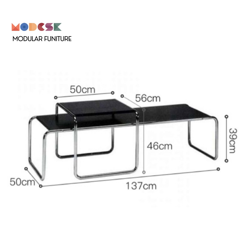 Bàn Sofa, Bàn Trà Bộ 2 bàn Modesk được làm từ khung Inox 304 (không sét rỉ bền bỉ với thời gian, không như Inox 201 nổi chấm vàng sau một thời gian); được đánh sáng bóng kết hợp với Ván MFC An Cường lựa chọn giữa màu trắng và màu đen