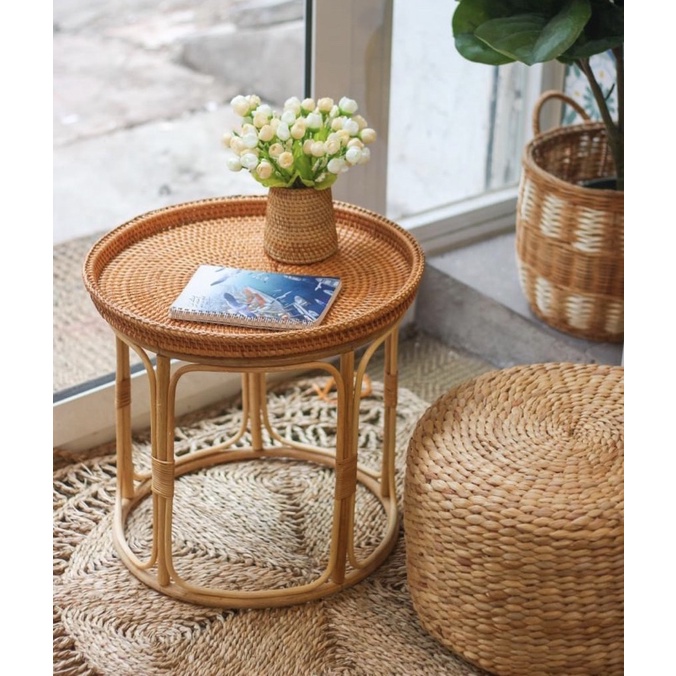 Bàn song mây tròn kem khay vintageBàn cao 41cm