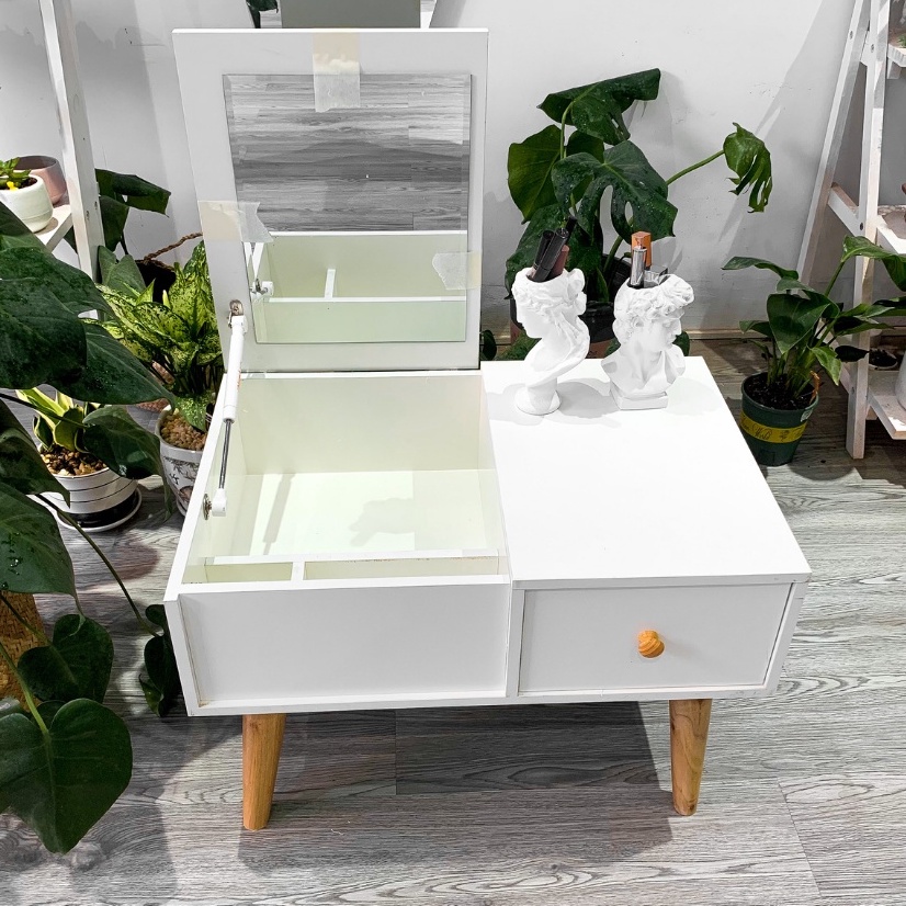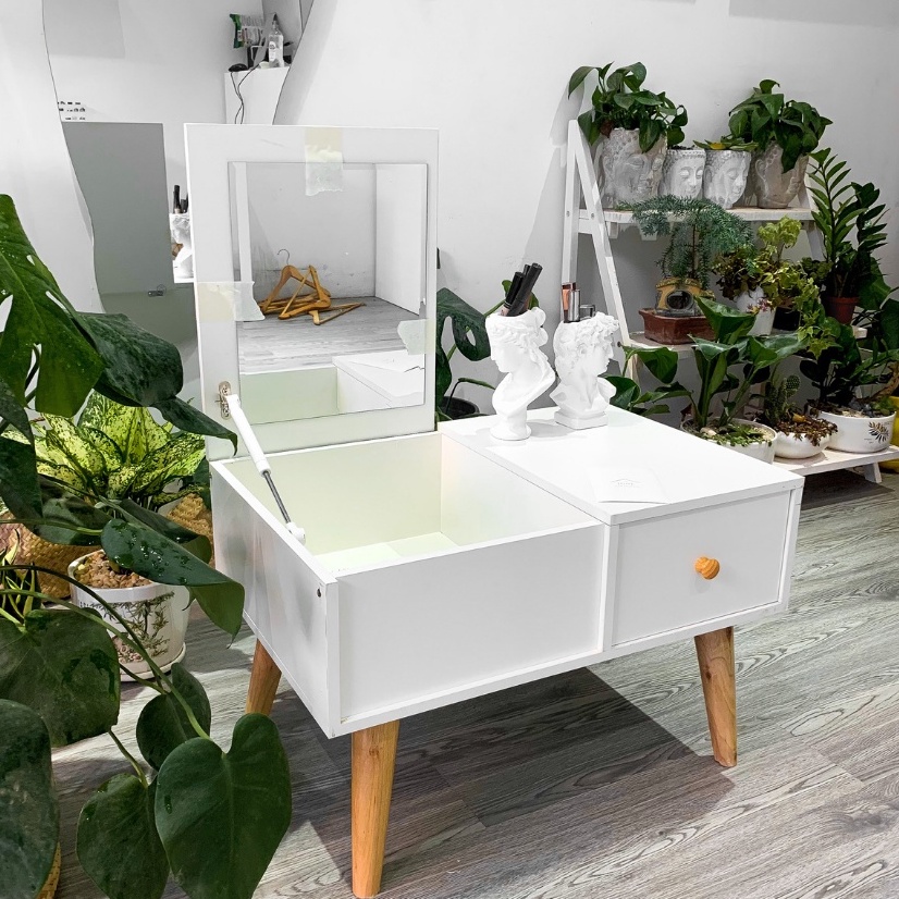 🍀 Bàn phấn thông minh thiết kế gương gập là loại bàn phấn đa năng, khi không cần trang điểm, gương có thể úp xuống tạo thành một chiếc bàn liền khối về mặt phẳng để làm việc vô cùng tiện lợi. Mặt trên bạn có thể làm việc còn phần dưới là những khoảng trống giúp bạn cất chứa các phụ kiện trang điểm hoặc những cuốn sách yêu thích của bạn.