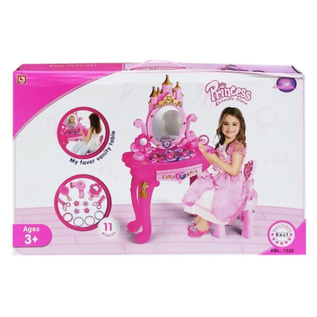 Bàn trang điểm công chúa có ghế ngồi 1520Bộ đồ chơi bàn trang điểm dành cho bé bao gồm 1 bàn trang điểm có gương sang trọng, 1 ghế, máy sấy, mỹ phẩm, vòng cổ, nhẫn, lược,...