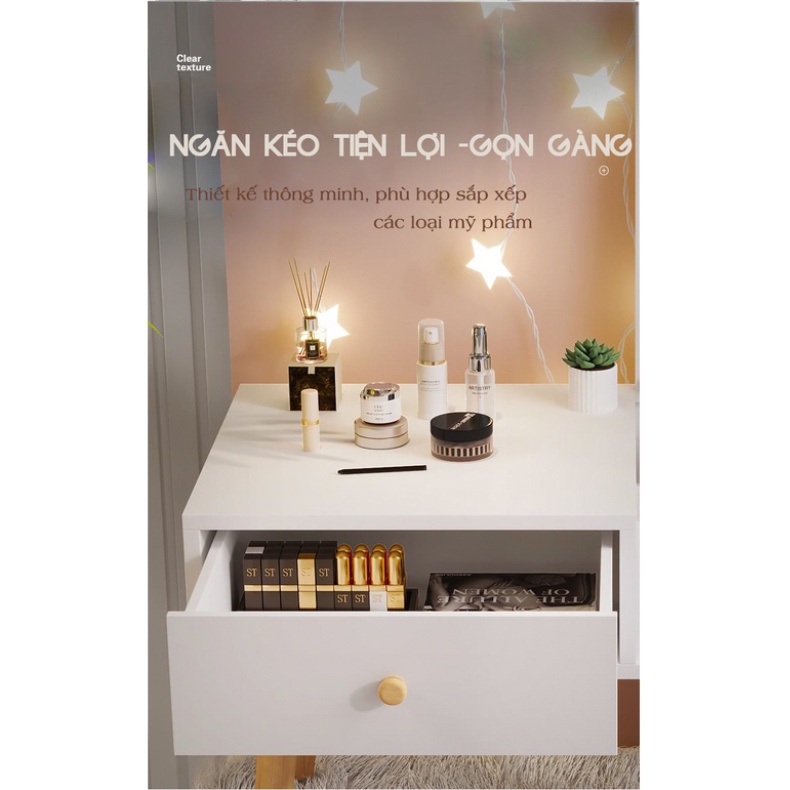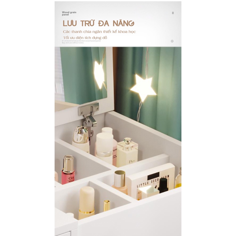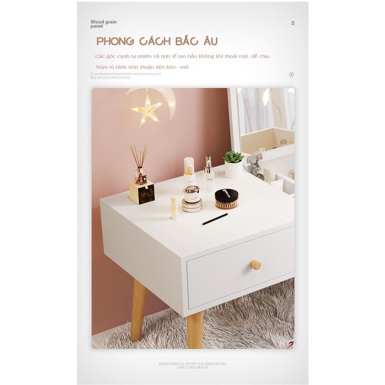 Bàn trang điểm mini ngồi bệt kèm gương có mặt làm từ gỗ MDF phủ Melamine làm cho nó tăng độ bóng loáng, chống trầy xước, chống ẩm mốc tốt, giúp sản phẩm kéo dài tuổi thọ. Được thiết kế vô cùng đẹp mắt và ấn tượng. Với kiểu dáng đa dạng và hiện đại hơn nhiều so với các mẫu bàn trang điểm mini giá rẻ thông thường sẽ tạo nên một không gian make up của hội chị em vô cùng hiện đại, tiện nghi sang trọng nhất cho căn phòng của bạn
