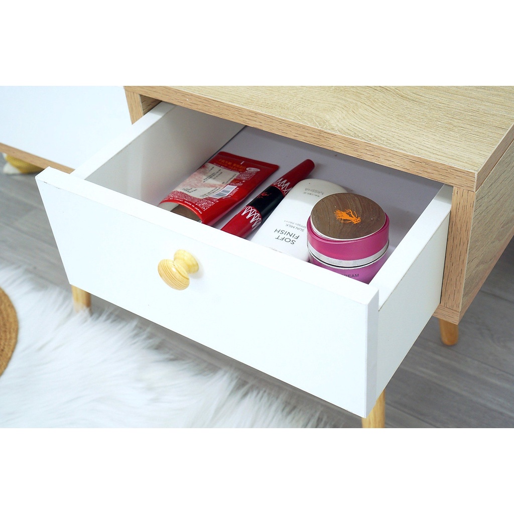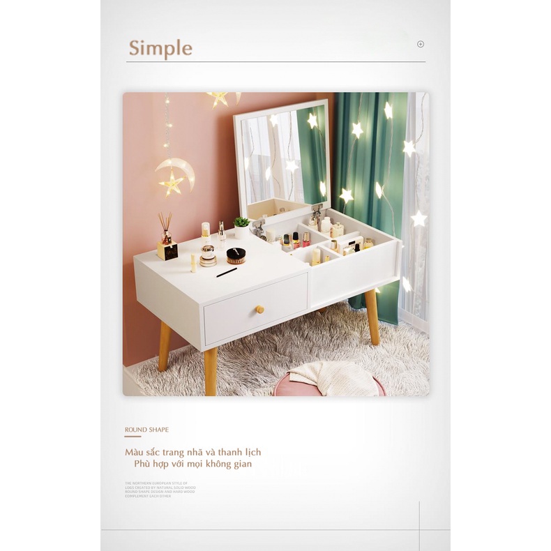 - Bàn trang điểm gỗ tự nhiên kiểu Hàn mang thiết kế Scandinavian phù hợp với không gian phòng, giúp cho việc bố trí thật thuận tiện