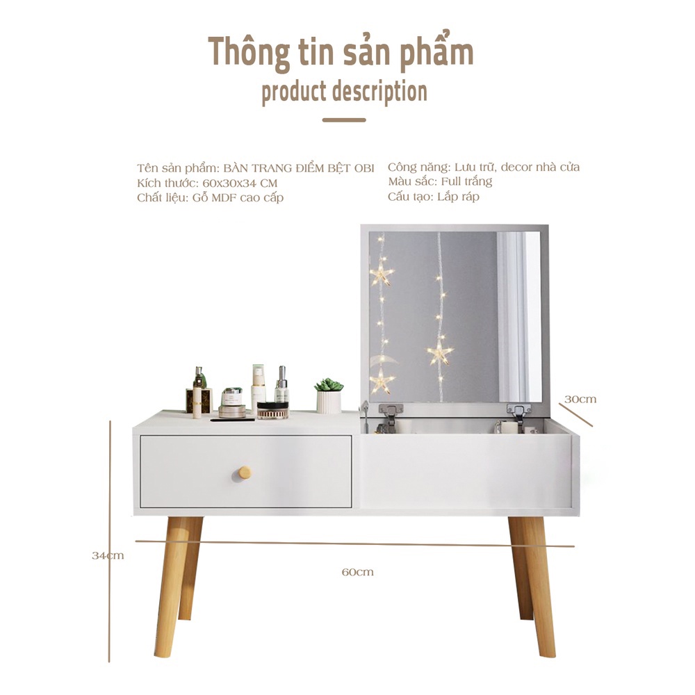 - Sản phẩm tự lắp ráp, nguyên kiện bao gồm bộ dụng cụ lắp ráp, hình ảnh & Video hướng dẫn sử dụng bàn trang điểm bệt