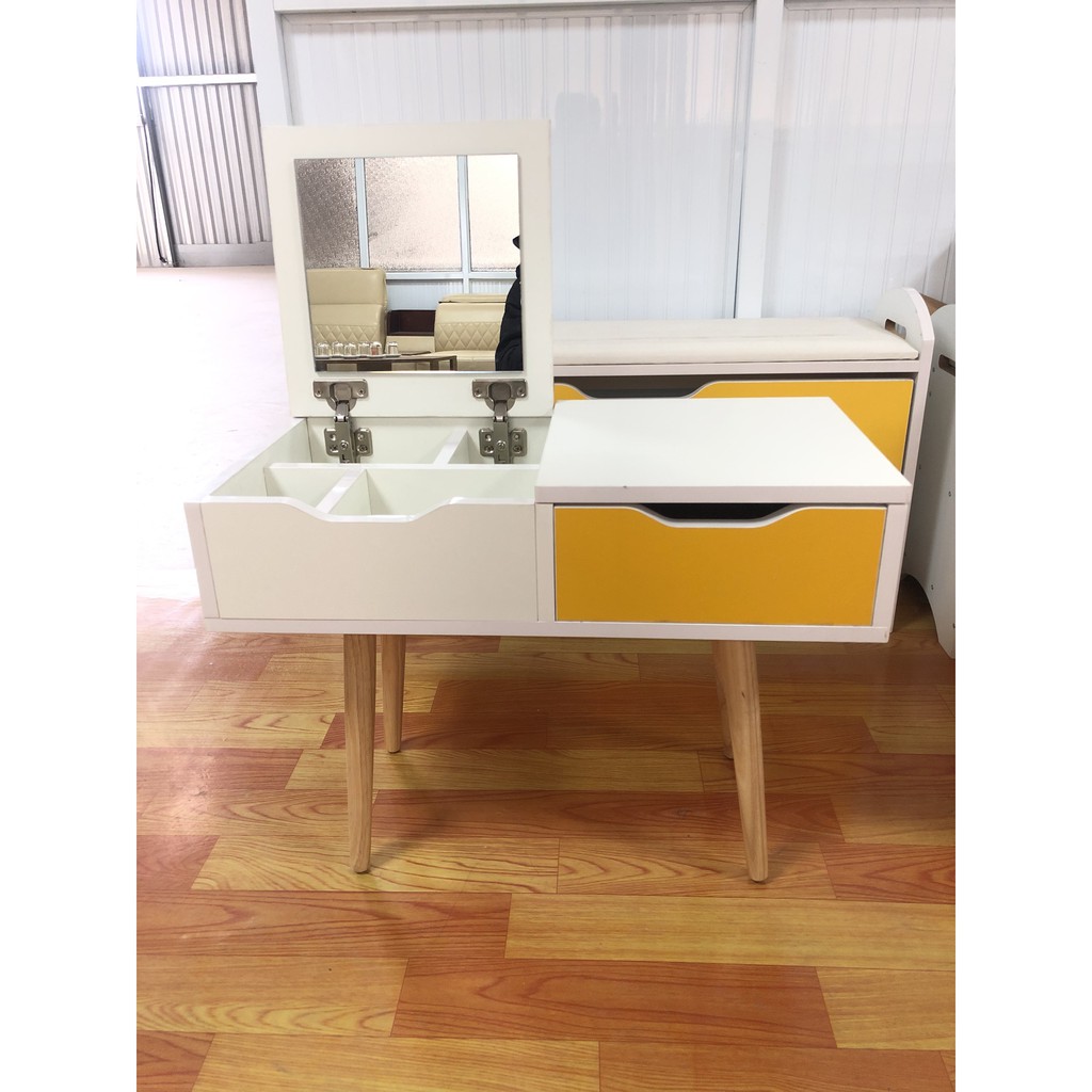 + Khi gương được mở lên, là một chiếc bàn trang điểm tiện lợi với nhiều ô lưu trữ để mỹ phẩm gọn gàng, còn khi gương được gập xuống lại trở thành một chiếc bàn làm việc cá nhân rộng rãi.