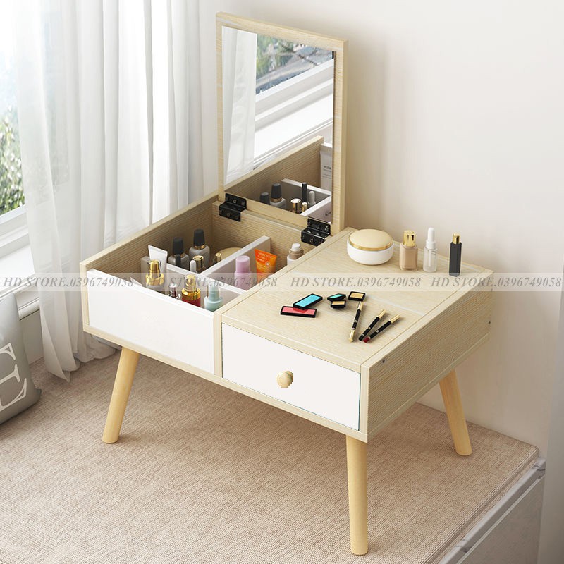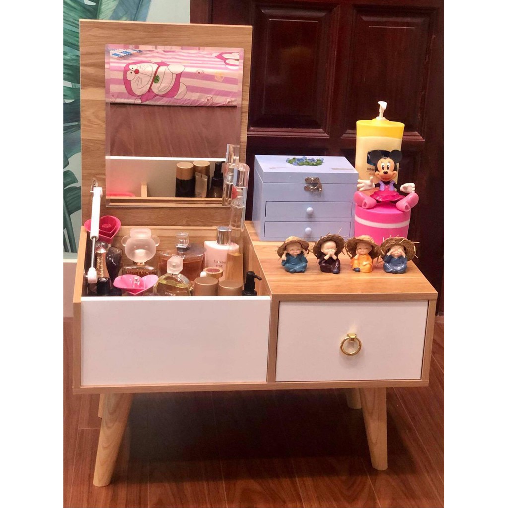 -Công năng sản phẩm: Bàn phấn thông minh thiết kế gương gập là loại bàn phấn đa năng, khi không cần trang điểm, gương có thể úp xuống tạo thành một chiếc bàn liền khối về mặt phẳng để làm việc vô cùng tiện lợi. Mặt trên bạn có thể làm việc còn phần dưới là những khoảng trống giúp bạn cất chứa các phụ kiện trang điểm hoặc những cuốn sách yêu thích của bạn. Là phụ nữ ai cũng mong muốn mình trở nên xinh đẹp.