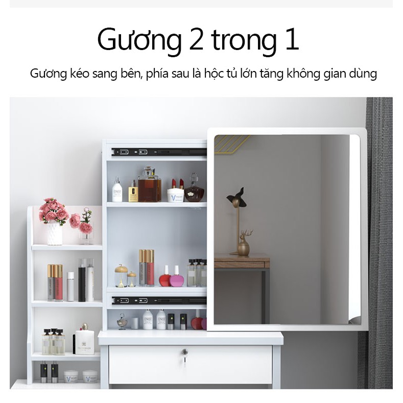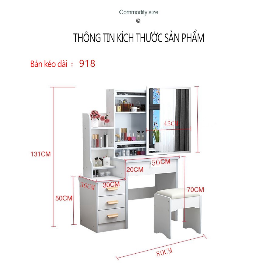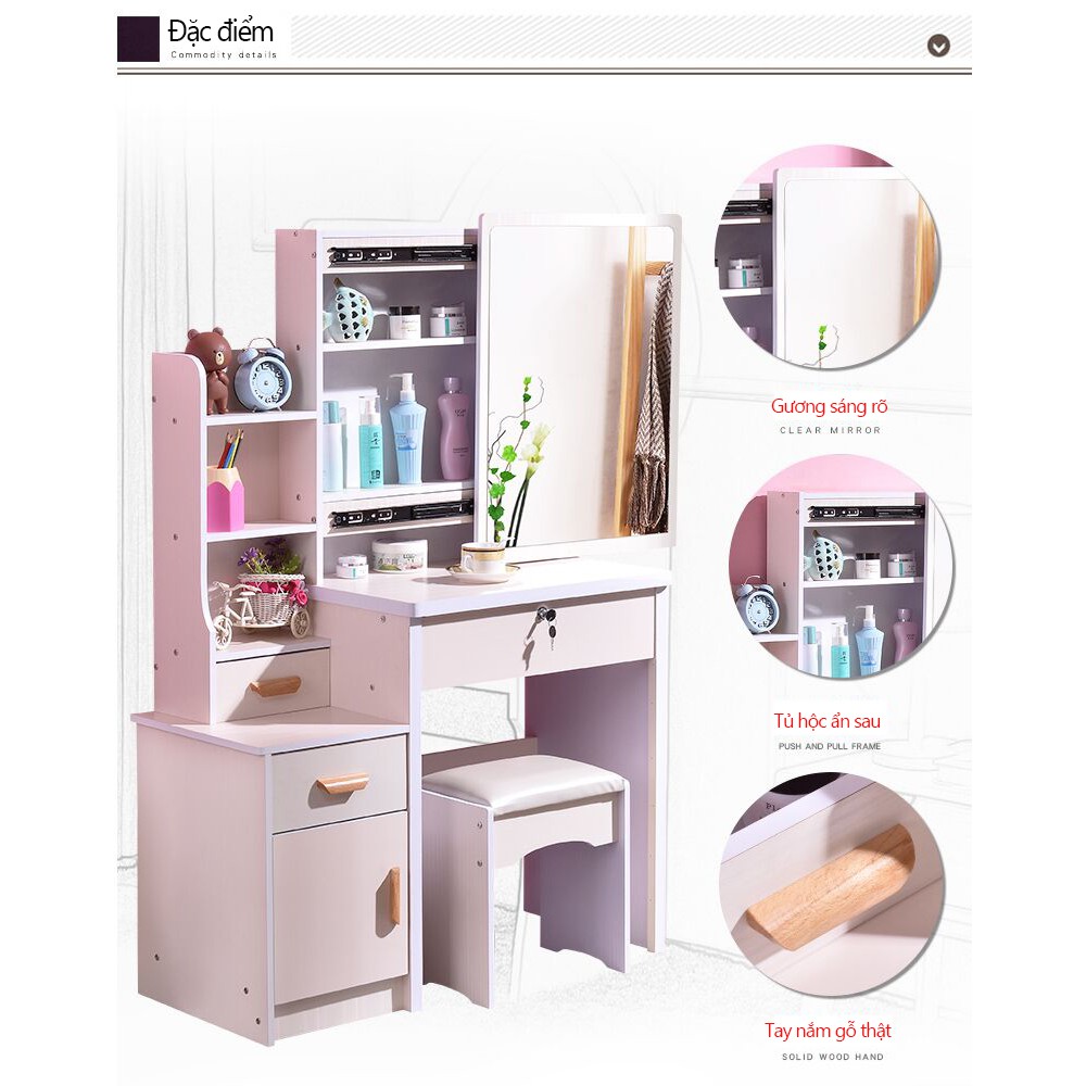 Cửa hàng cung cấp hai kiểu bàn trang điểm màu hồng và trắng để đáp ứng nhu cầu bạn muốn. Với áp dụng thiết kế sáng tạo đơn giản và phong cách, phun lớp sơn gỗ chất lượng cao và thân thiện với môi trường, tuân thủ đầy đủ các tiêu chuẩn sức khỏe và chăm sóc sức khỏe theo quy địnhTính năng của sản phẩm: 1. Bề mặt gương tráng thủy ngân sáng đẹp 2. Gương trang điểm có thể đẩy ra, phía sau là ngăn chứa đồ 3. Thiết kế tay cầm bằng gỗ chắc chắn 4. Ngăn lưu trữ đồ có giá trị ; 5. Ghế mềm kem bàn trang điểm