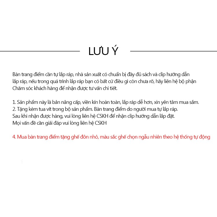 Lưu ý đặc biệt: Bàn trang điểm này cần phải tự lắp đặt. Cửa hàng cung cấp các công cụ lắp đặt, tua vít, bản vẽ lắp đặt và video cài đặt, để bạn có thể dễ dàng lắp ráp tại nhà. Ghế đôn giao màu sắc ngẫu nhiên theo hệ thống tự động.