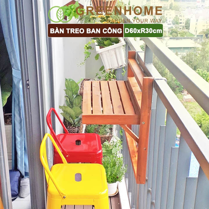 Giới thiệu Bàn treo ban công, D60xR30cm, màu gỗ tự nhiên, gỗ tràm, siêu bền, phù hợp mọi lan can |Greenhome