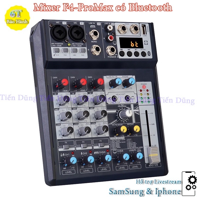 Bàn Mixer F4 ProMax Chạy Nguồn 5V Tích Hợp Karaoke Livestream Có Bluetooth - USB Màn Hình Led Hiển Thị.👉 LƯU Ý : Shop có phân loại bàn Mixer F4-PRO và F4-PROMAX Sản phẩm như ảnh phân loại nên khách hàng lựa chọn đúng sản phẩm mình cần