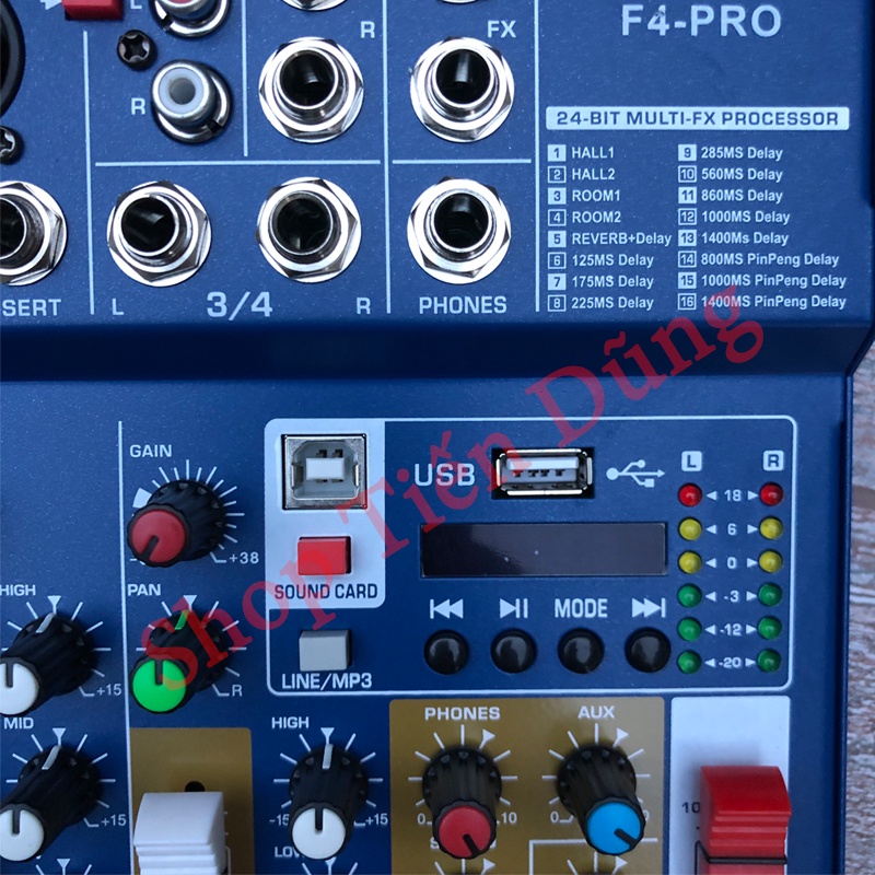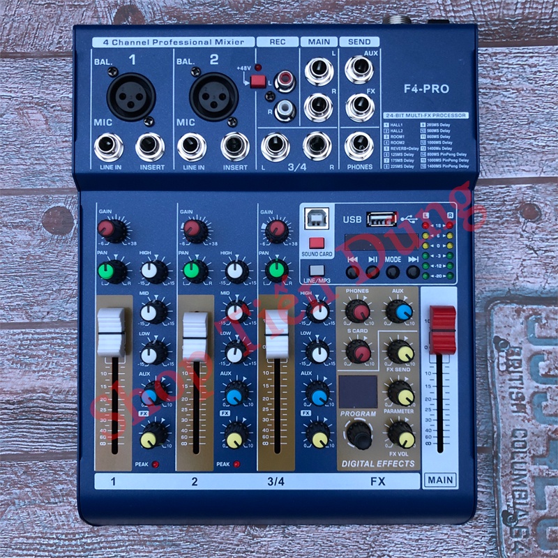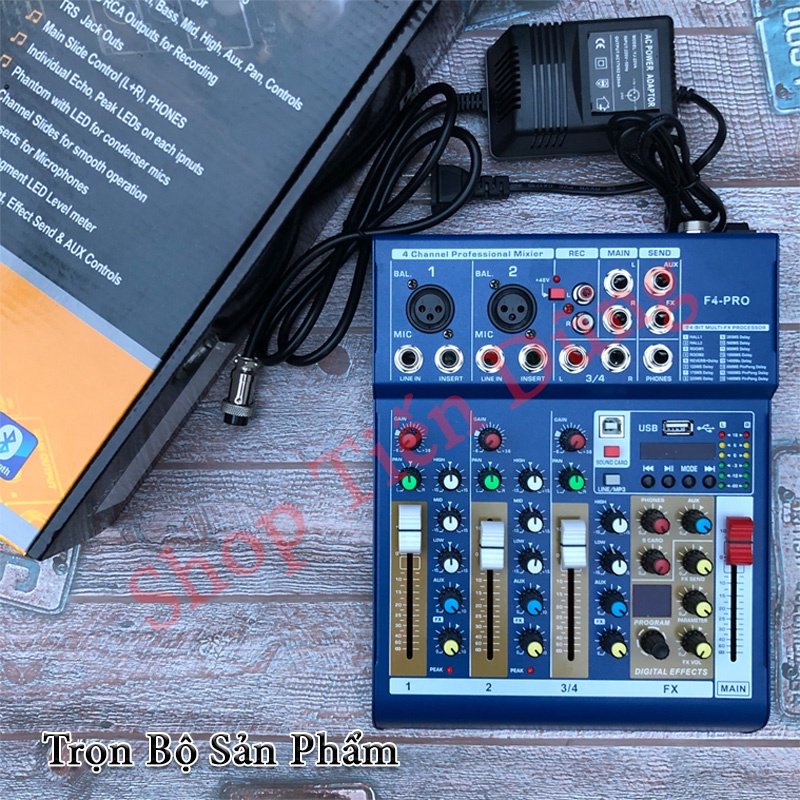 - Bộ trộn âm thanh Mixer F4 PRO là dòng mixer mini xử lý hiệu ứng âm thanh chất lượng cao với 4 kênh đầu vào, cung cấp nguồn phantom 48V cho mic condenser, hỗ trợ nghe nhạc, thu âm và hát karaoke.