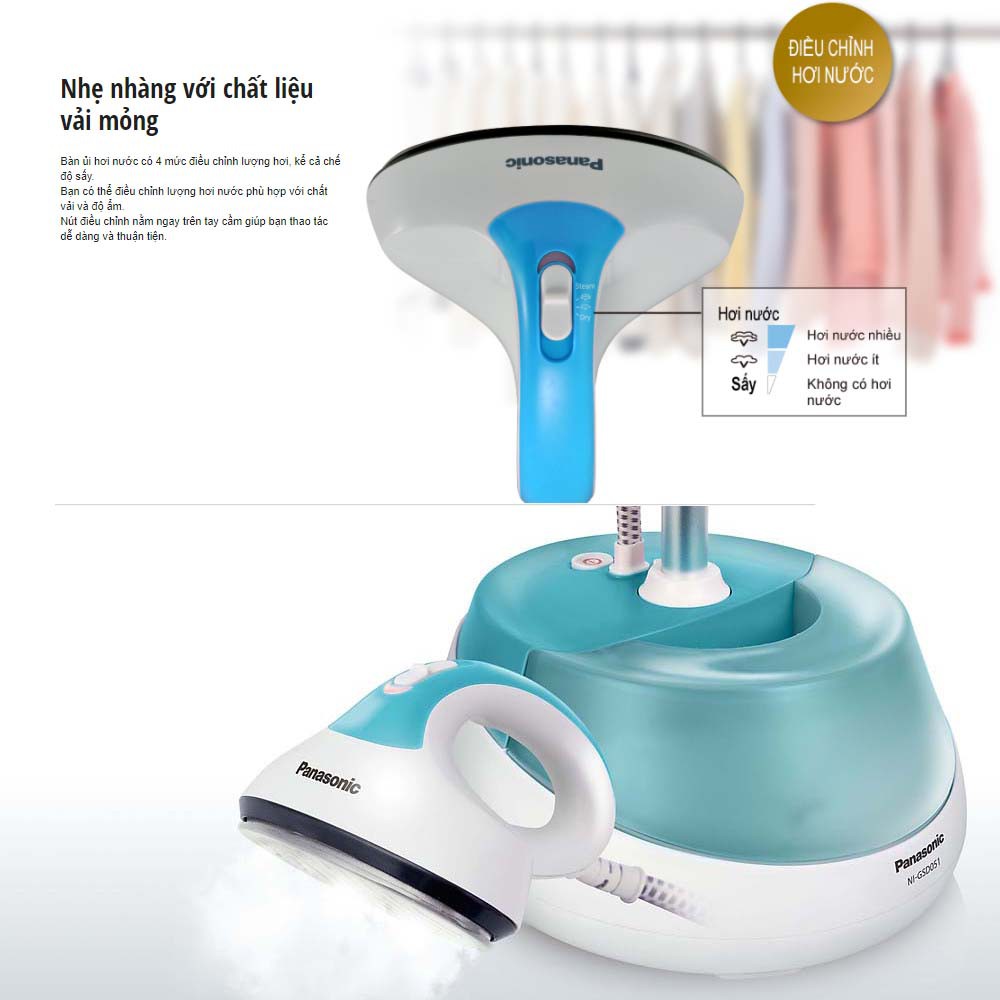 - Bàn là hơi nước đứng Panasonic NI-GSD051GRA giúp ủi phẳng mọi vết nhăn. Bàn là hơi nước cầm tay Panasonic NI-GSD051GRA phun hơi nước đứng với công suất hoạt động 1.500W giúp bạn ủi thẳng quần áo nhanh chóng chỉ trong tích tắc, tiết kiệm nhiều thời gian và công sức.