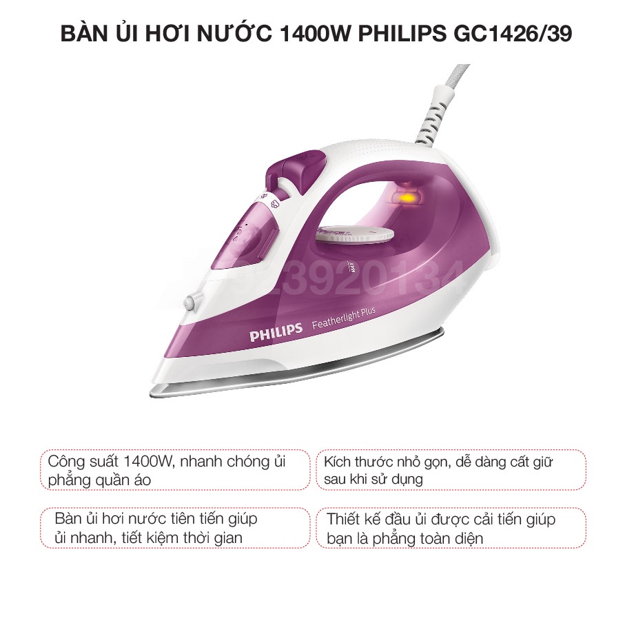 Thiết Bị Điện Gia Dụng > Thiết bị điện gia dụng nhỏ > Bàn là khô & Hơi nước || [Mã ELHADEV giảm 4% đơn 300K] Bàn ủi hơi nước 1400w Philips GC1426/39Còn hàng