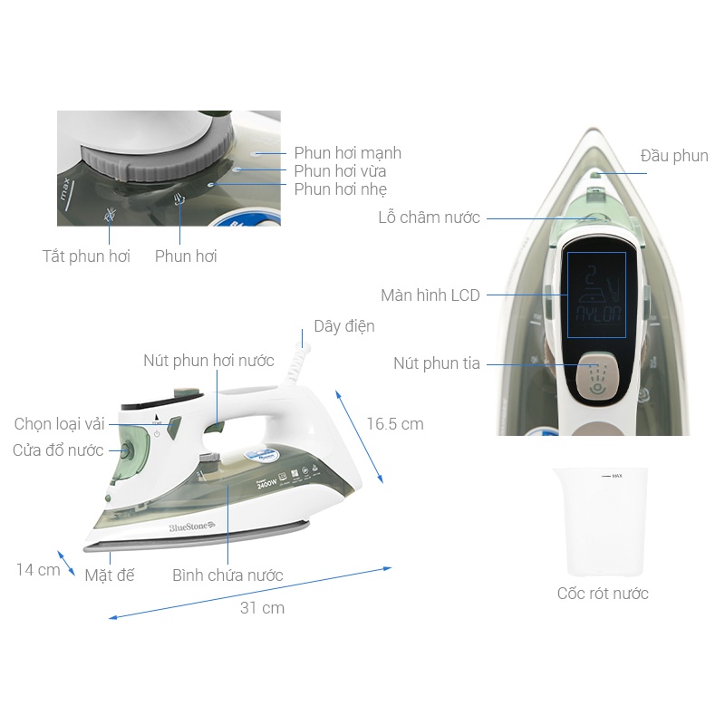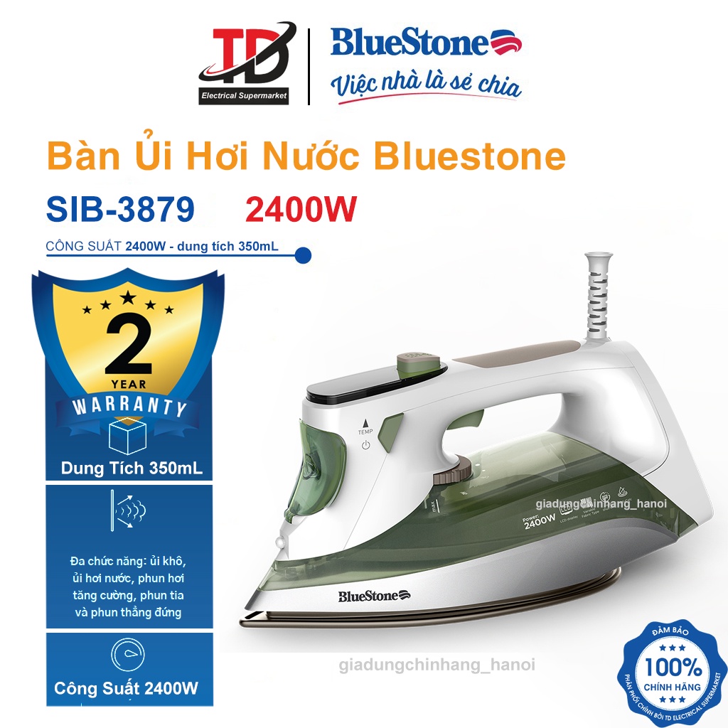 Bàn ủi hơi nước Bluestone SIB-3879 kiểu dáng nhỏ gọn, màu sắc trang nhã, công suất lớn 2020W - 2400WThông số kỹ thuật Bàn ủi hơi nước Bluestone SIB-3879