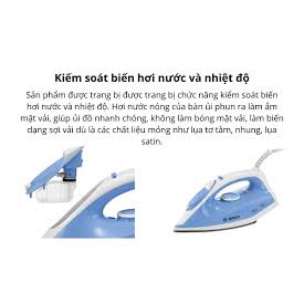 Sản phẩm được trang bị được trang bị chức năng kiểm soát biến hơi nước và nhiệt độ. Hơi nước nóng của bàn ủi phun ra làm ẩm mặt vải, giúp ủi đồ nhanh chóng, không làm bóng mặt vải, làm biến dạng sợi vải dù là các chất liệu mỏng như lụa tơ tằm, nhung, lụa satin.