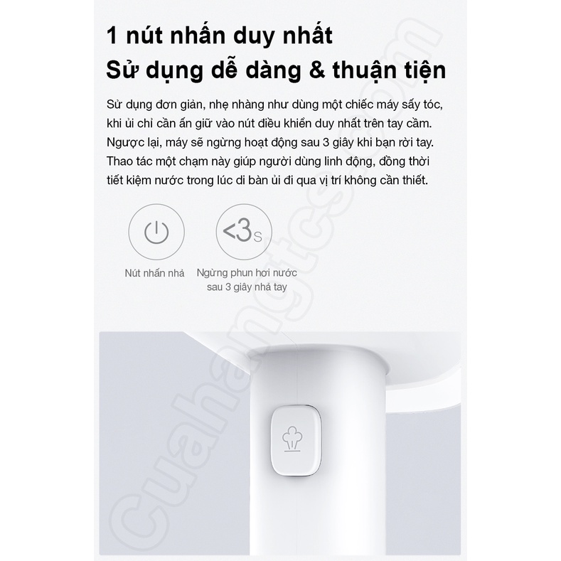 >Cách thức sử dụng đơn giản, khi ủi bạn chỉ cần ấn giữ nút điều khiển duy nhất trên tay cầm. Ngược lại, máy sẽ tự động dừng sau khoảng 3 giây khi bạn rời tay. Thao tác một chạm này có thể giúp người dùng linh động hơn, đồng thời tiết kiệm được lượng nước trong lúc di bàn ủi đi qua vị trí không cần thiết.