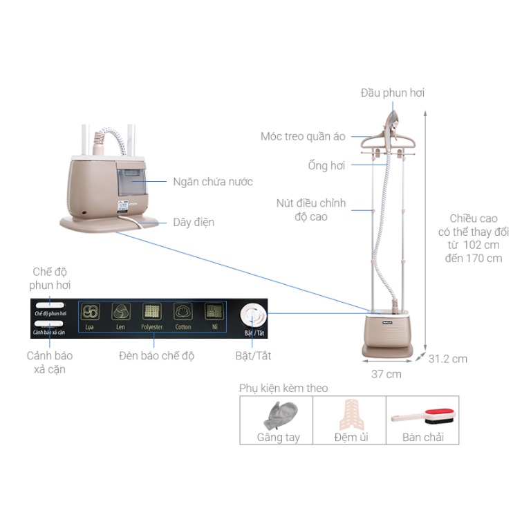 - Lượng phun hơi đến 40 g/phút chinh phục các vết nhăn cứng đầu.