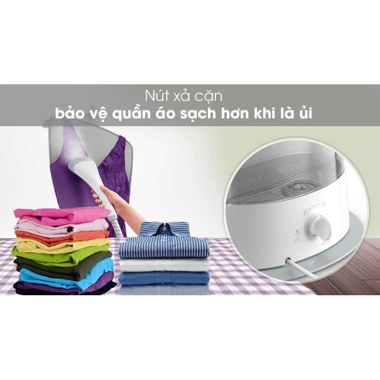 - Tích hợp nút xả cặn để làm sạch bình chứa và hệ thống dẫn hơi, đảm bảo hơi nước ra tinh khiết, tránh gây ố vàng trên quần áo