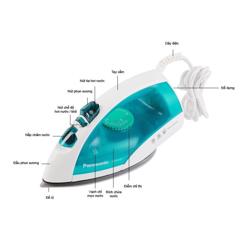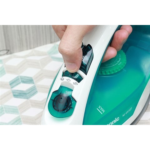 Giới thiệu sản phẩm Bàn ủi hơi nước PANASONIC NI-E410TMRA (Xanh) .Bàn Ủi Hơi Nước Panasonic PABU-NI-E410TMRA có thiết kế đế.hình chữ U độc đáo, giúp cho vải không bị nhăn lại trong khi ủi,.công việc ủi quần áo của bạn trở nên dễ dàng và thú vị hơn. Hơi.nước từ 29 lỗ thông, dọc theo rãnh chữ U tản đều trên đế với tỉ lệ.tạo hơi nước cao hơn 25% so với các bàn ủi hơi nước trước đây. Đồng.thời đế dài hơn 5%, giúp bạn rút ngắn thời gian ủi quần áo....Các tính năng nổi bật..- Khởi động nhanh, và công suất 1800 – 2150 W mạnh mẽ, giúp ủi.thẳng quần áo nhanh chóng...- Hệ thống tự động chống bám cặn, dễ dàng làm sạch và có giá trị sử.dụng lâu bền...- Đế chống dính Titan chống trầy xước, lướt nhẹ nhàng trên vải,.giúp ủi quần áo được nhanh hơn, tránh tình trạng bám bẩn, chất.dơ...- Đế thiết kế tuần hoàn hơi nước...- Đế hình chữ U, cùng thiết kế bàn ủi xẻ rãnh và mũi nhọn, giúp ủi.các vị trí khó như hàng nút, xếp li một cách dễ dàng...- Đế dài hơn 5%, giúp bạn rút ngắn thời gian ủi quần áo...- Bàn ủi với nhiều mức nhiệt độ, có thể điều chỉnh nhiệt độ phù hợp.cho từng loại vải một cách dễ dàng và chính xác nhằm bảo vệ quần áo.khỏi tình trạng bị cháy xém gây hư hỏng...- Hơi nước có thể điều chỉnh mức độ...- Chức năng phun sương, cho phép bạn bổ sung thêm nước lên quần áo.khi cần...- Hơi nước phun thành tia, phun mạnh, giúp là thẳng các nếp nhăn.cứng đầu...- Lỗ nạp nước rộng, bạn dễ dàng châm nước vào khoang chứa nước...- Tay cầm chắc chắn và được thiết kế chống trượt, nên mang lại cảm.giác thoải mái cho người sử dụng...- Khớp dây điện có thể xoay 360 độ linh hoạt, giúp bạn dễ dàng xoay.trở bàn ủi...- Kiểu dáng nhỏ gọn, trọng lượng bàn ủi nhẹ, dễ sử dụng...Thông số kỹ thuật..- Thương hiệu Panasonic..- Bảo hành 12 tháng..- Loại bàn ủi: Hơi nước..- Công suất: 1800 – 2150 W..- Điện áp: 220 - 240 V..- Dung tích bình chứa nước: 200 ml..- Kích thước: 256 x 113 x 136 mm..- Đế: Titan (bạc)..- Trọng lượng: 1.0 Kg..- Chống bám cặn: Có..- Phun nước: Có..- Tia nước:có- bảo hành 12 tháng