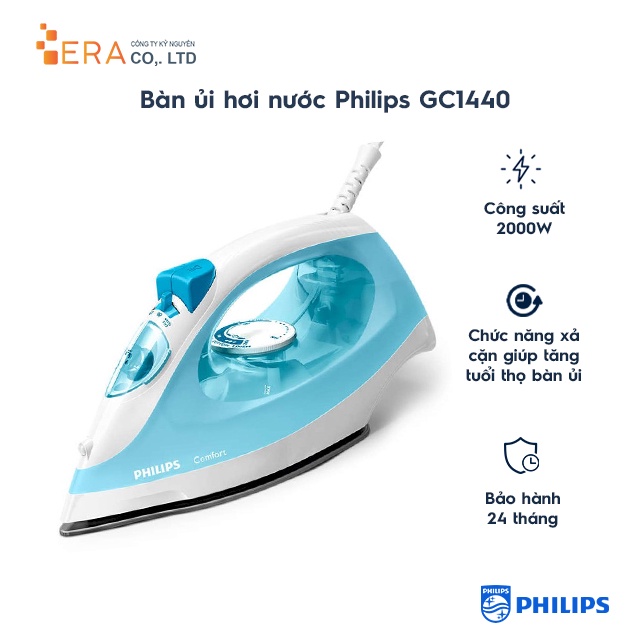 - Bàn ủi hơi nước Philips GC1440 mũi bàn ủi thiết kế nhọn giúp bạn là vào những hàng cúc dễ dàng. Màu sắc sản phẩm trang nhã trông rất đẹp mắt. Thân bàn là được làm từ nhựa cao cấp cho độ bền cao. Chức năng xả cặn giúp làm sạch cặn bẩn dễ dàng, chống tắc tia nước để việc sử dụng đạt hiệu quả cao. Mặt đế bằng gốm lâu bền trượt êm ái trên mọi mặt vải, cộng thêm bề mặt chống dính, chống xước và dễ lau sạch.