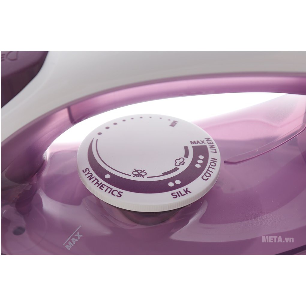 Nút xoay điều khiển nhiệt độ lớn, giúp bạn điều chỉnh nhiệt độ ủi phù hợp với từng loại quần áo từ thấp đến cao theo từng chất liệu vải (vải nylon, lụa, len, cotton, vải lanh), tránh phai màu vải.