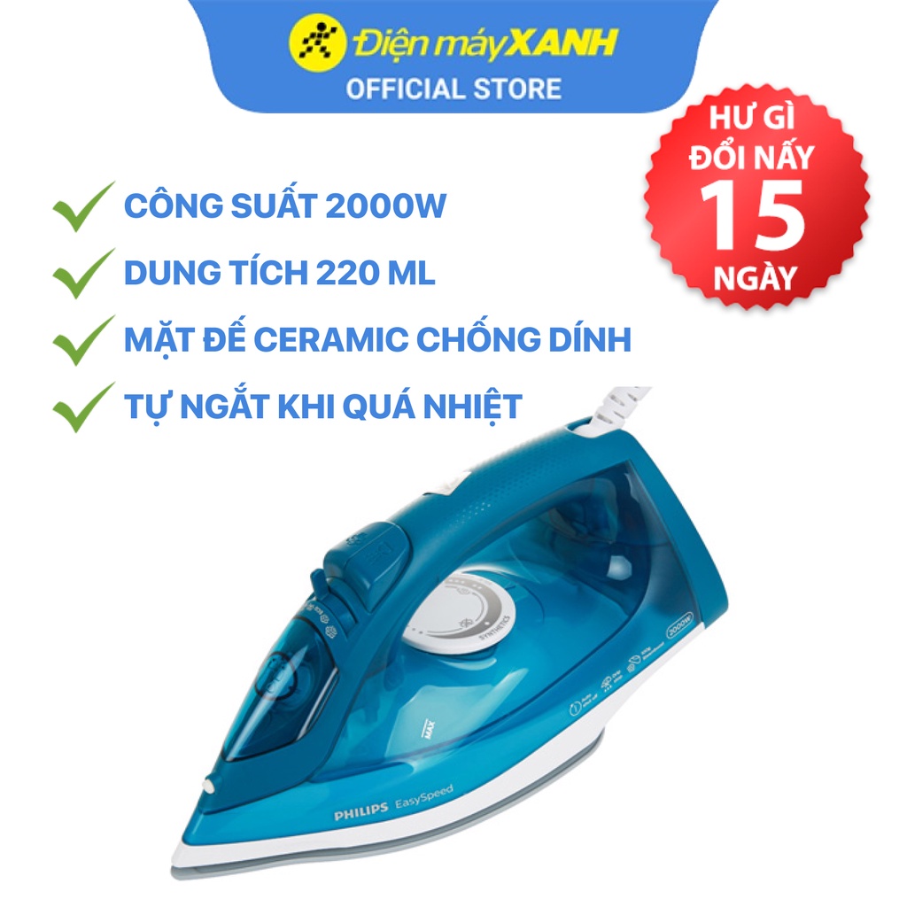 ● Bàn ủi hơi nước Philips màu xanh dương nổi bật, đẹp mắt, tô điểm cho không gian sử dụng● Bàn ủi hơi nước làm nóng nhanh, ủi hiệu quả với công suất 1700 - 2000 W, tiết kiệm thời gian cho người dùng