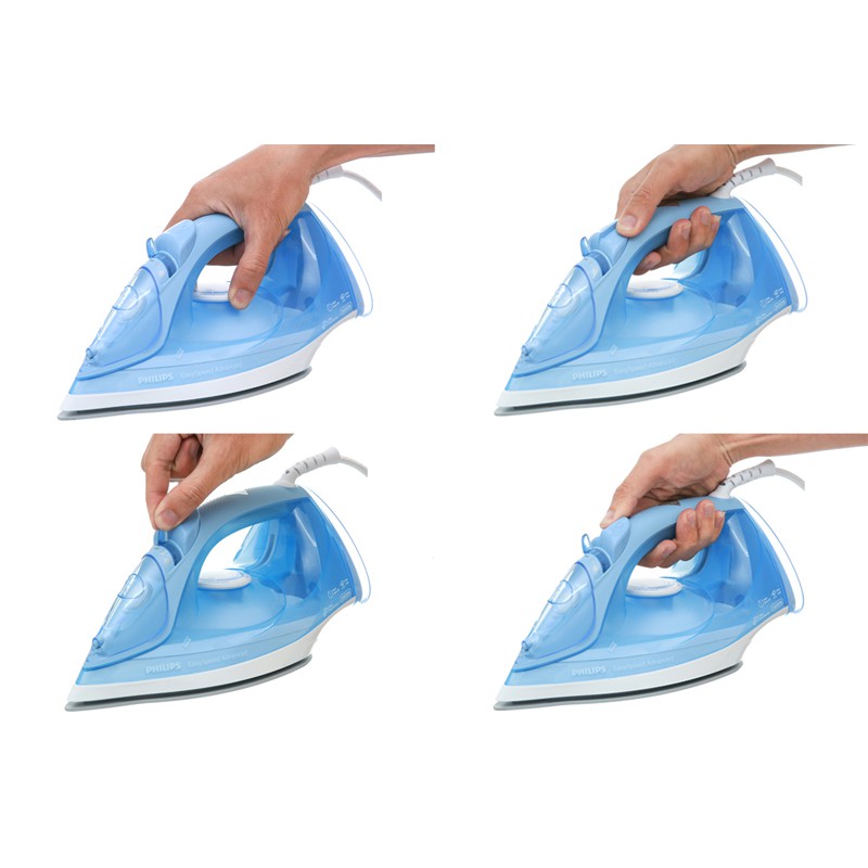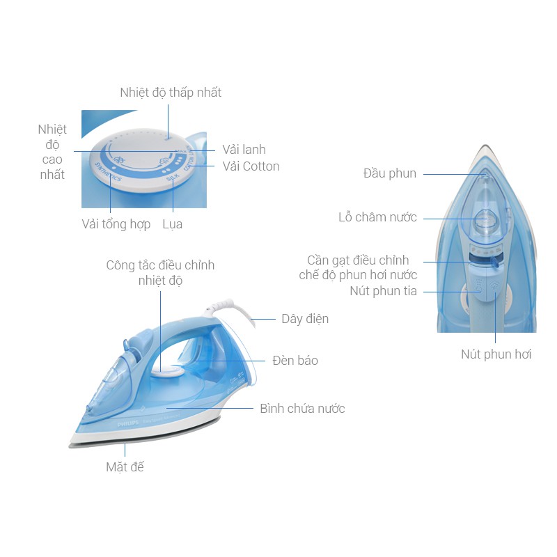 ✵Bàn ủi Philips kiểu dáng gọn gàng, thanh lịch, màu xanh dương nhẹ nhàng tạo cảm giác tươi mát, trẻ trung cho không gian sử dụng✵Bàn ủi công suất 2400 W tùy chỉnh nhiệt độ bằng núm vặn, là ủi hiệu quả mọi nếp nhăn trên mọi chất liệu vải