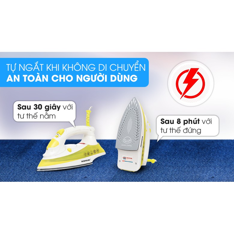 An tâm hoàn toàn khi sử dụng bàn là hơi SUNHOUSE vì được trang bị cảm biến nhiệt an toàn, tự động đóng ngắt khi quá tải nhiệt. Bàn là sẽ tự ngắt khi đạt đến nhiệt độ lý tưởng (phù hợp với các loại vải khác nhau).
