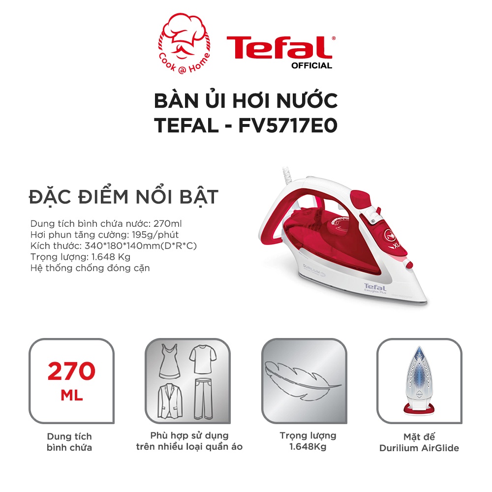 - Bàn ủi hơi nước Tefal FV5717E0 thuộc thương hiệu Tefal của Pháp, đảm bảo uy tín về chất lượng