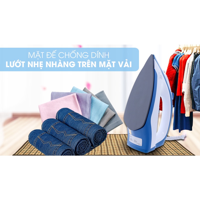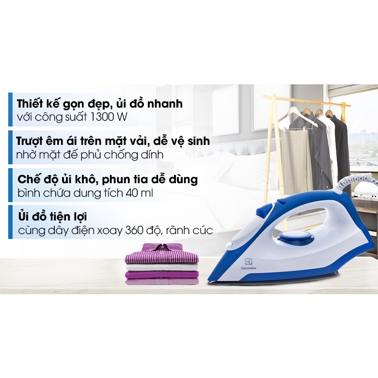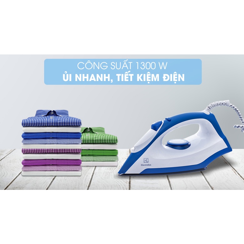 - Bàn ủi khô Electrolux với kiểu dáng nhỏ gọn, công suất hoạt động hiệu quả sẽ là sự chọn lựa để bạn tối ưu hóa việc làm thẳng áo quần cho bạn và người thân trong gia đình.