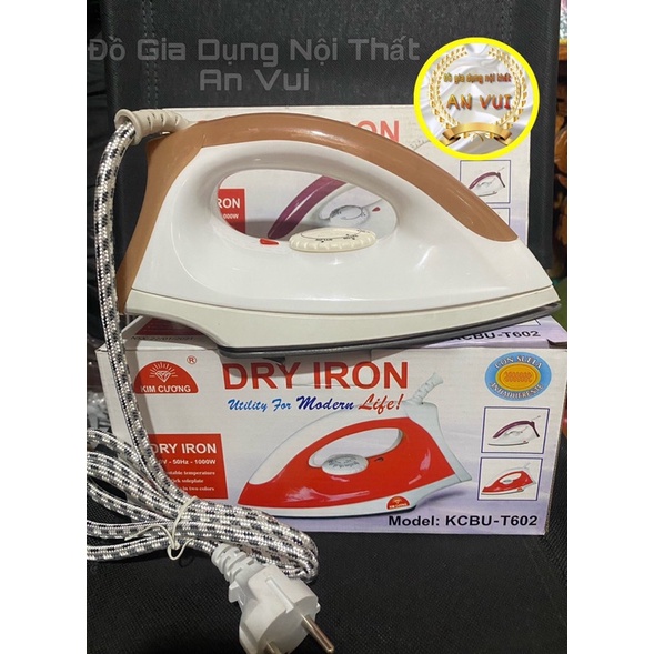 Bàn ủi khô Kim Cương T-602 có đế bàn ủi phủ lớp chống dính thuộc dòng sản phẩm mới của thương hiệu thiết bị bếp, gia dụng nổi tiếng KIM CƯƠNG ,Được sản xuất và lắp ráp tại nhà máy Kim Cương Việt Nam và đạt danh hiệu hàng Việt Nam chất lượng cao , Bàn ủi có công suất 1000W, hoạt động mạnh mẽ, sẽ giúp bạn rút ngắn tối đa thời gian là ủi quần áo.