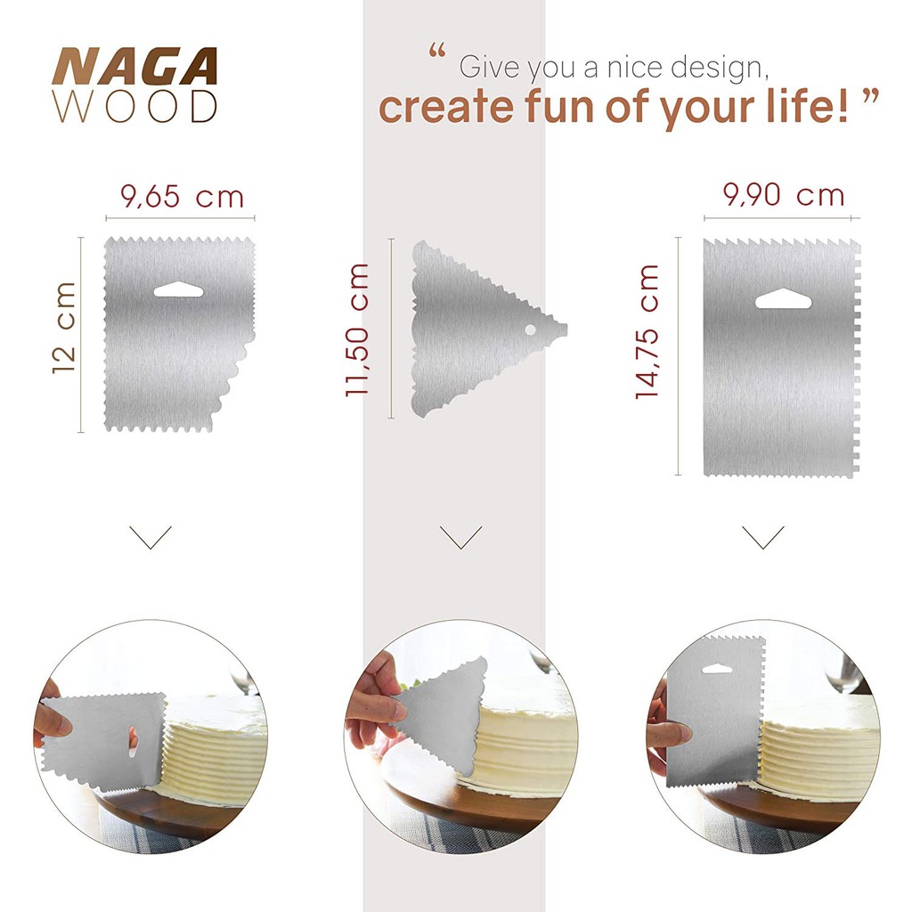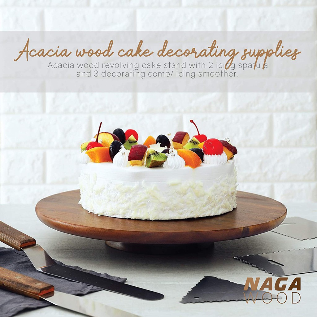 - COMBO 6 DỤNG CỤ TRANG TRÍ BÁNH KEM: 1 bàn xoay bánh kem bằng gỗ 33cm, 2 dao chà láng 32cm, 3 dao cắt vét vân bánh tạo hoa văn khác nhau.