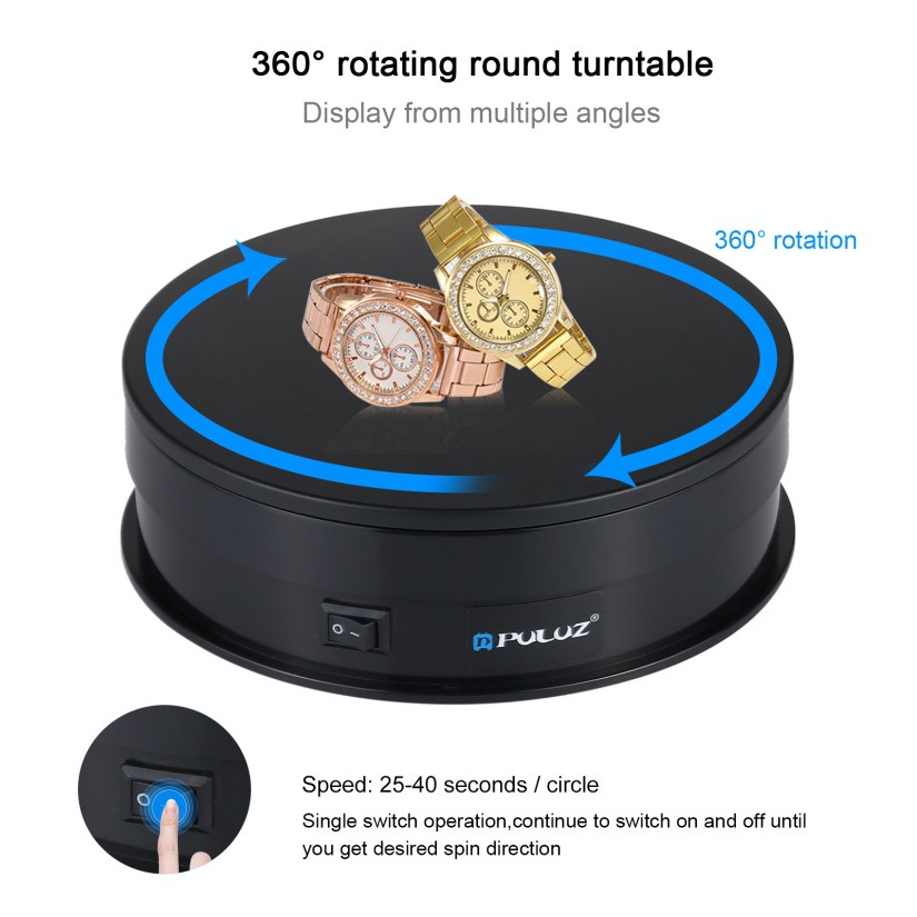 ✅Công dụng: Bàn xoay 360 PULUZ được thiết kế với công dụng đa năng cho nhiều mục đích khác nhau. Lý tưởng để trưng bày đồ trang sức, đồng hồ, sản phẩm kỹ thuật số, dầu gội đầu, thủy tinh, túi xách. Hoặc sử dụng trong chụp quay video sản phẩm xoay 360 độ.