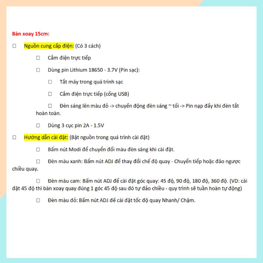 **LƯU Ý: Nên cho đế xoay nghỉ ngơi sau 7-8 tiếng hoạt động liên tục để sản phẩm đạt được đến tuổi thọ tối đa (dùng điện)