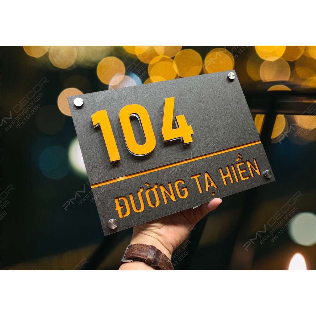 Nhà cửa & Đời sống > Nội thất > Khác || BẢNG, BIỂN SỐ NHÀ. Alcorest màu vàng Hội An + Mica ghi sần, số nổi 1cm đế mica trong 1cm, ngoài trời. BSN-PMV158Còn hàng