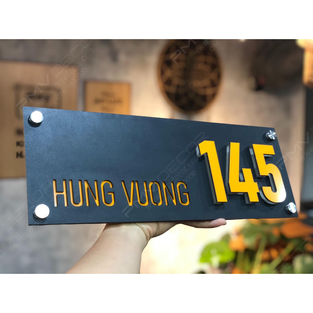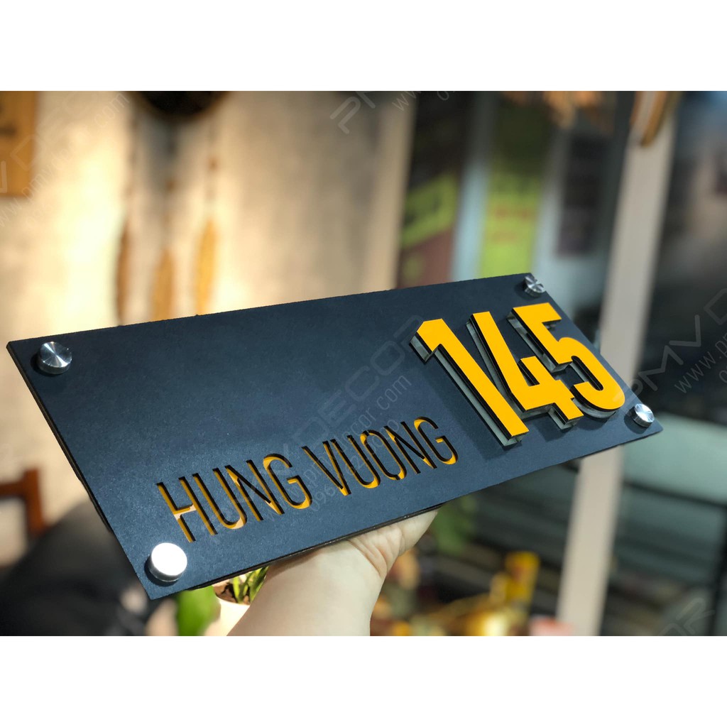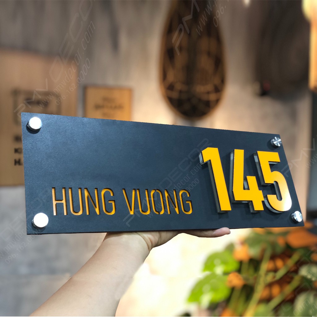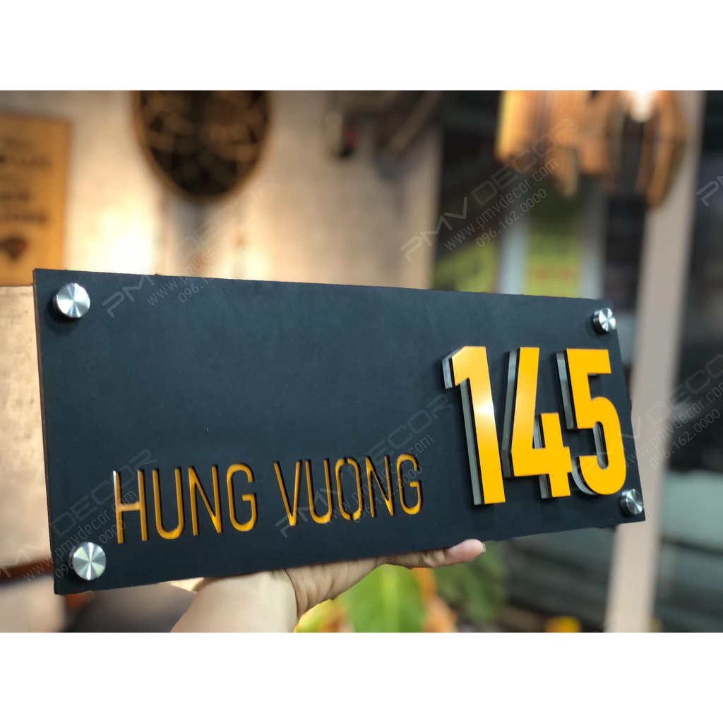 Nhà cửa & Đời sống > Nội thất > Khác || BẢNG, BIỂN SỐ NHÀ. Alcorest vàng + Mica đen sần, chi tiết dán nổi 1cm, ngoài trời, BSN-PMV63Còn hàng