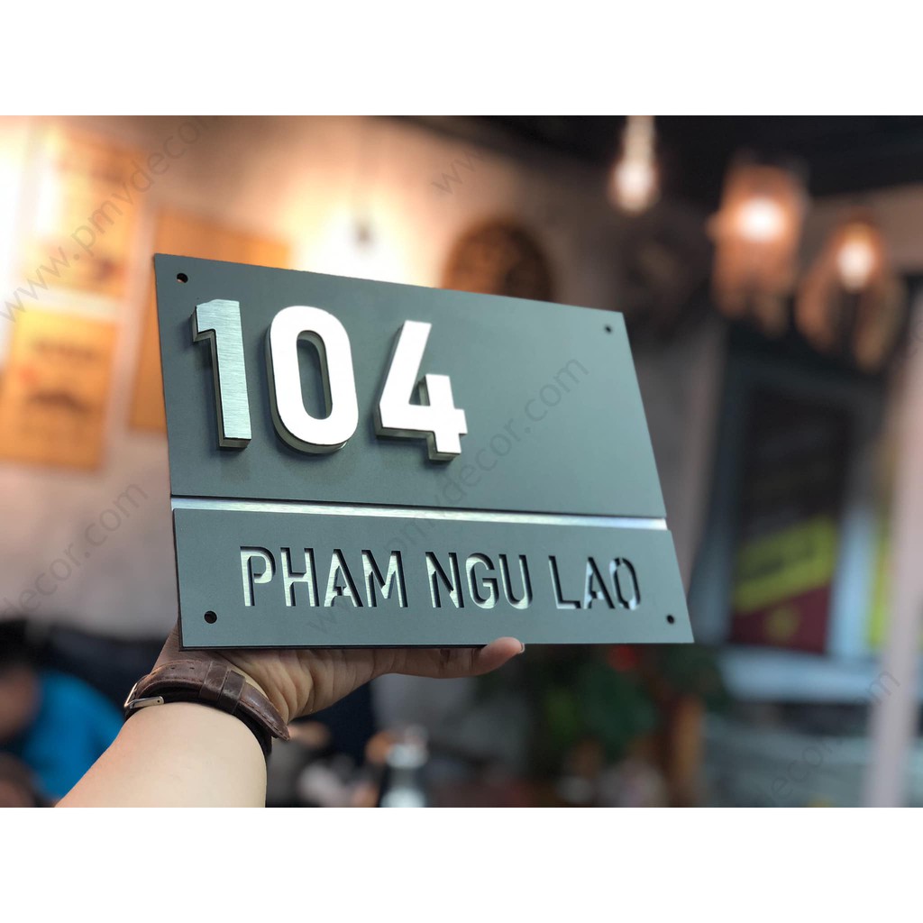 Giới thiệu BẢNG, BIỂN SỐ NHÀ. Alcorest xước bạc + Mica ghi sần, số nổi đế mica trong 1cm, ngoài trời BSN-PMV57