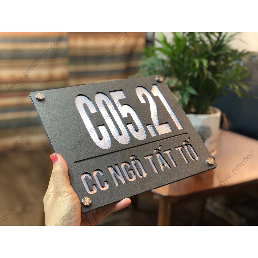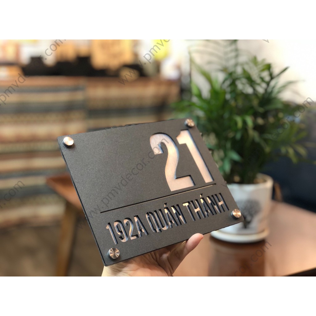 Nhà cửa & Đời sống > Nội thất > Khác || BẢNG, BIỂN SỐ NHÀ. Alcorest xước bạc + Mica ghi sần, số chìm, ngoài trời. BSN-PMV54Còn hàng