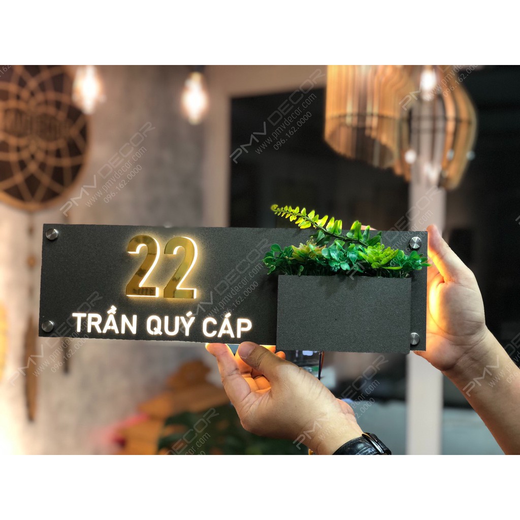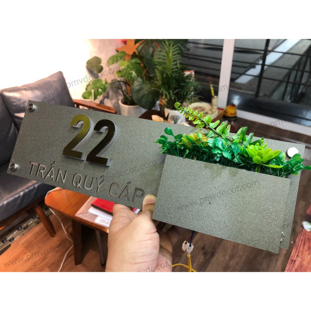 Giới thiệu BẢNG, BIỂN SỐ NHÀ. Có đèn LED, size 40*12cm Mica cháo+ Mica màu ghi sần, số nổi 1cm, trồng hoa, ngoài trời, BSN-PMV145