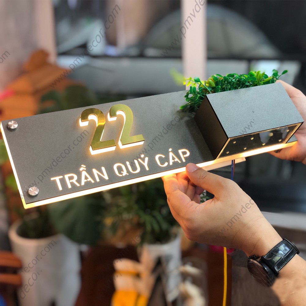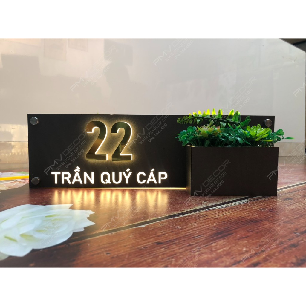 Nhà cửa & Đời sống > Nội thất > Khác || BẢNG, BIỂN SỐ NHÀ. Có đèn LED, size 40*12cm Mica cháo+ Mica màu ghi sần, số nổi 1cm, trồng hoa, ngoài trời, BSN-PMV145Còn hàng