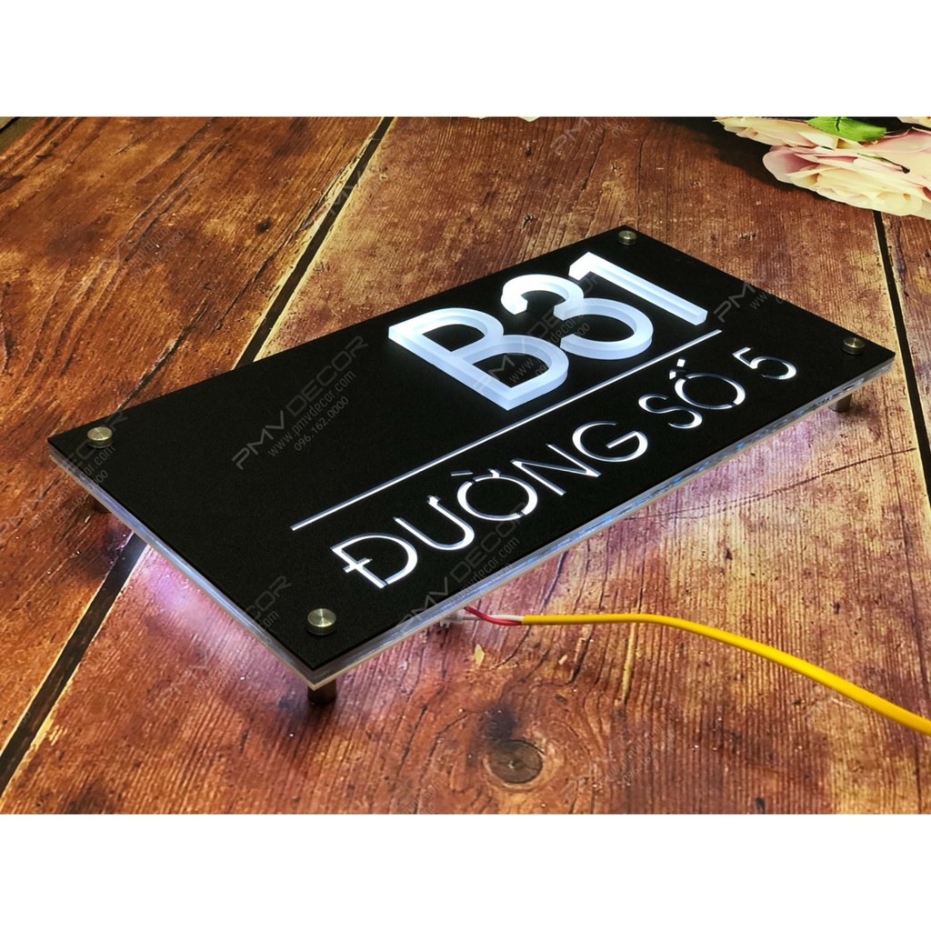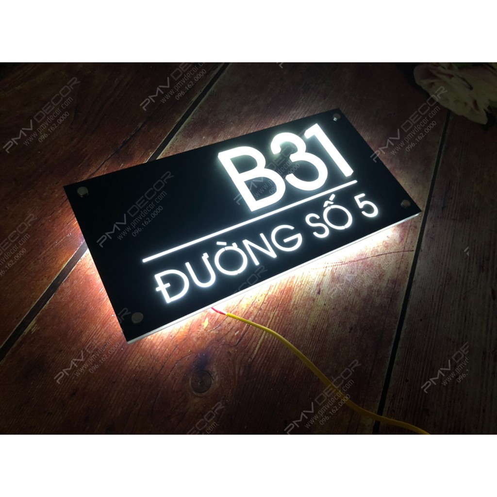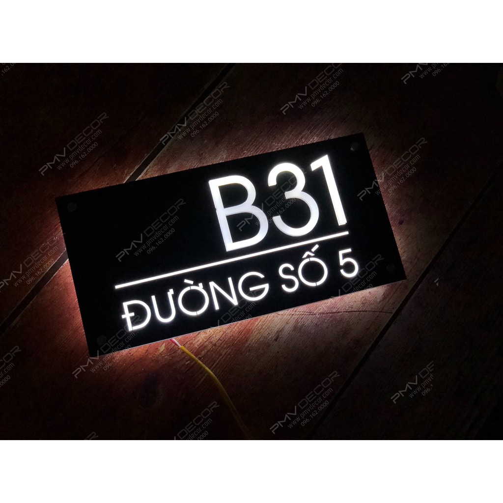 Nhà cửa & Đời sống > Nội thất > Khác || BẢNG, BIỂN SỐ NHÀ. Có đèn LED, Mica dẫn sáng + Mica màu đen sần, số nổi ngoài trời, BSN-PMV169Còn hàng
