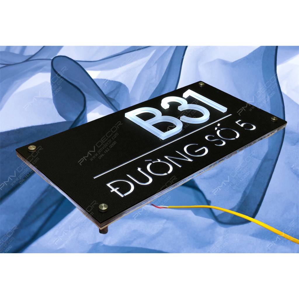 Giới thiệu BẢNG, BIỂN SỐ NHÀ. Có đèn LED, Mica dẫn sáng + Mica màu đen sần, số nổi ngoài trời, BSN-PMV169