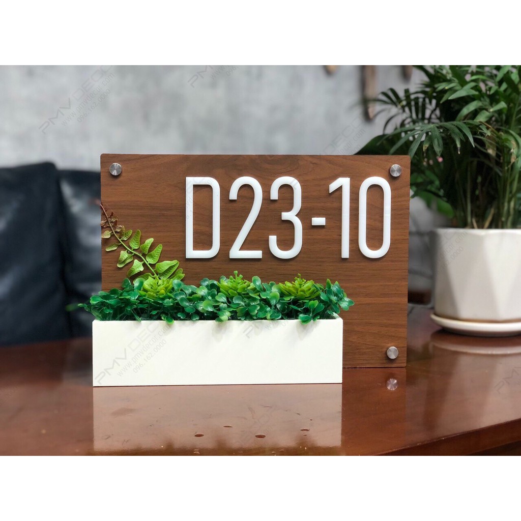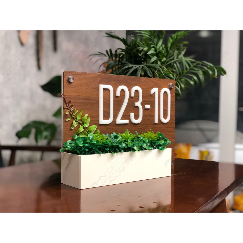 BẢNG, BIỂN SỐ NHÀ. Gỗ nhựa màu trắng + mica cán vân gỗ, có khay để trồng cây, có sẵn hoa giả, ngoài trời. BSN-PMV185