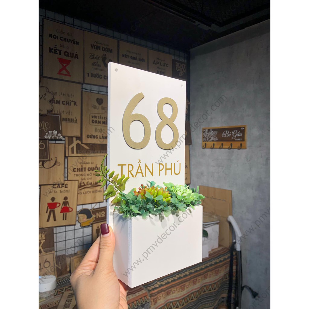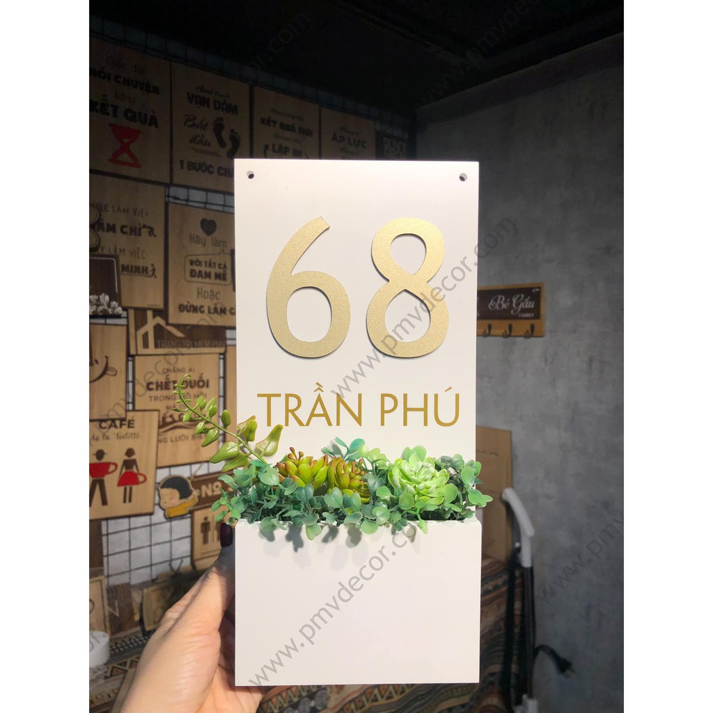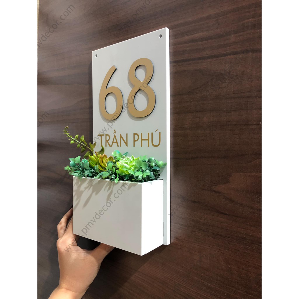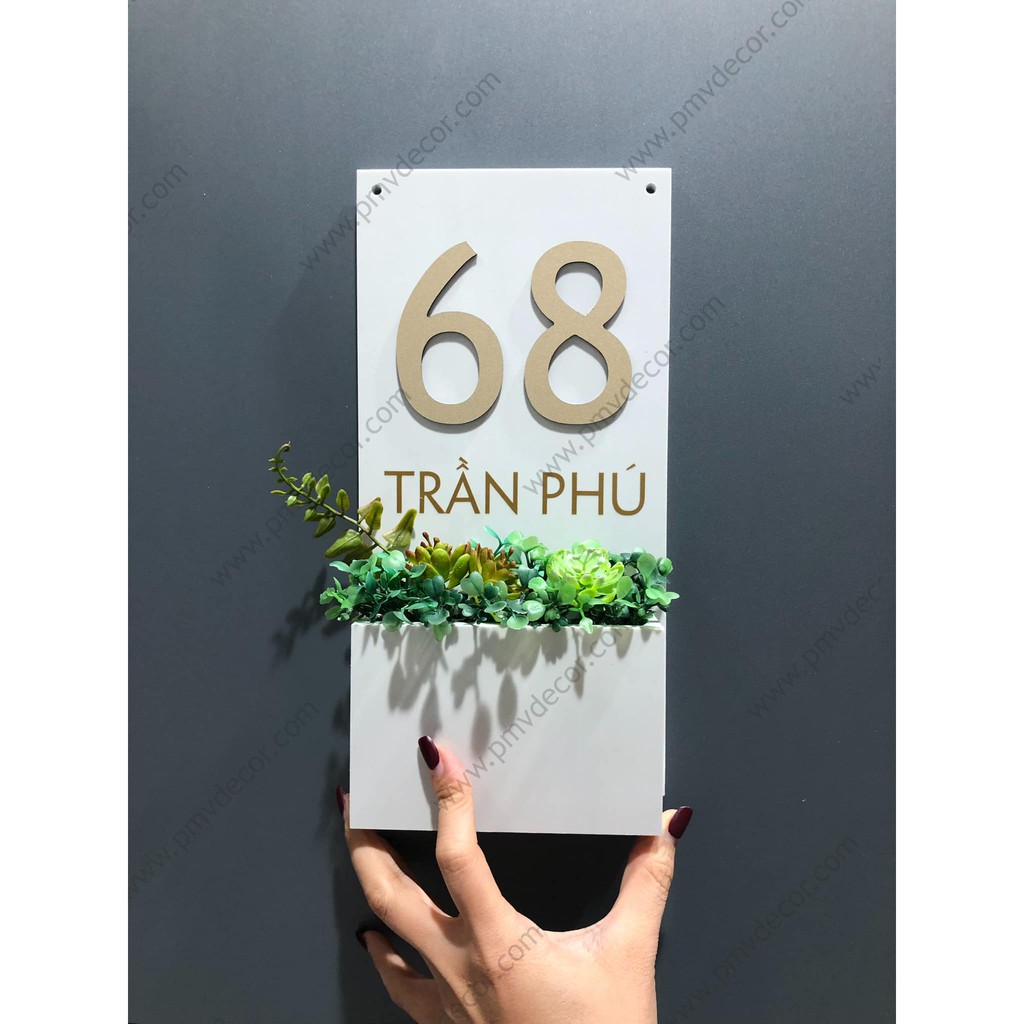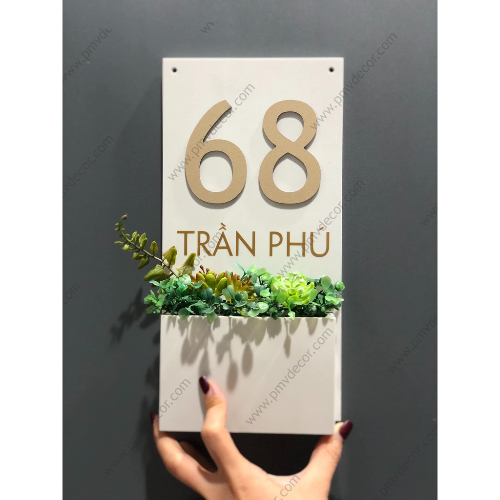 Nhà cửa & Đời sống > Nội thất > Khác || BẢNG, BIỂN SỐ NHÀ. Gỗ nhựa màu trắng, Nội dung màu đồng nhạt, có sẵn hoa giả, số nổi, ngoài trời. BSN-PMV50Còn hàng