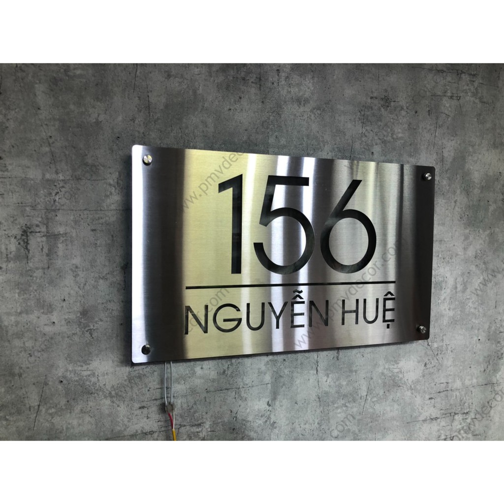 BẢNG, BIỂN SỐ NHÀ. Inox + Mica , có đèn led hắt sáng chân, chi tiết chìm, nội dung yêu cầu, để ngoài trời, BSN-PMV144