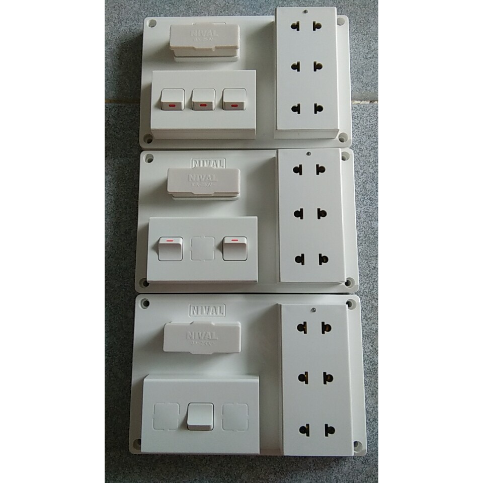 * Bảng điện cao cấp Nival có từ 1 đến 3 công tắc và 3 ổ cắm.- Bảng điện 1 công tắc (B1T) bao gồm: 3 ổ cắm ,1 công tắc, 1 cầu chì sứ